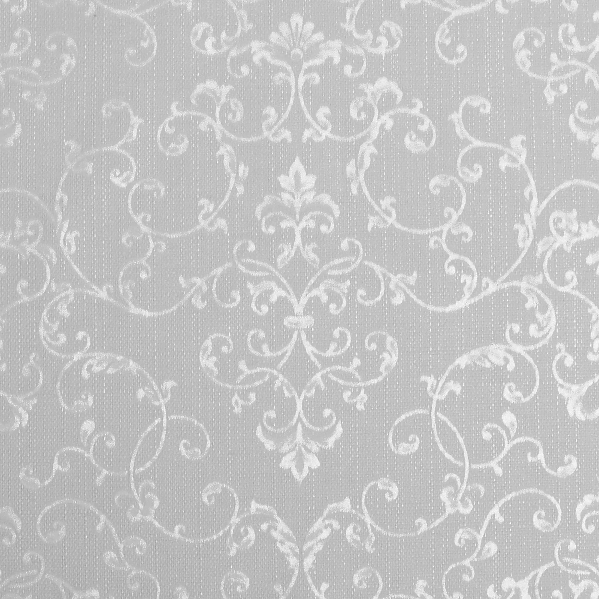 diese edle Tischdecke hat eine grobe, grau melierte Leinen Struktur. Darauf eingedruckt sieht man stilisierte, sich überlappende, weiße in sich verschlungene Ranken im orientalischen Stil. An den Spitzen der Ranken befinden sich in unterschiedlichen Größen und Abmessungen Strukturen in Blatt- oder Blumenform.