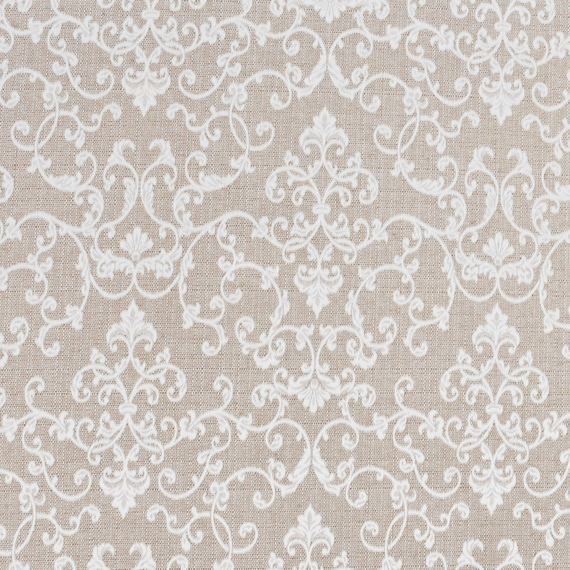 diese edle Tischdecke hat eine grobe, hellbraun melierte Leinen Struktur. Darauf eingedruckt sieht man stilisierte, sich überlappende, weiße in sich verschlungene Ranken im orientalischen Stil. An den Spitzen der Ranken befinden sich in unterschiedlichen Größen und Abmessungen Strukturen in Blatt- oder Blumenform.
