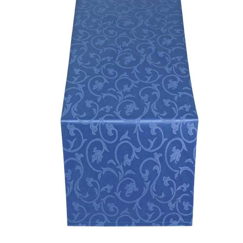 Das Design besticht durch stilisierte, gebogene Muster, die an gebogene Blumenstiele erinnern und in einer Blüte enden. Diese eng angeordneten Muster verleihen dem Tischläufer eine anmutige und edle Optik, die an den späten Barock erinnert.