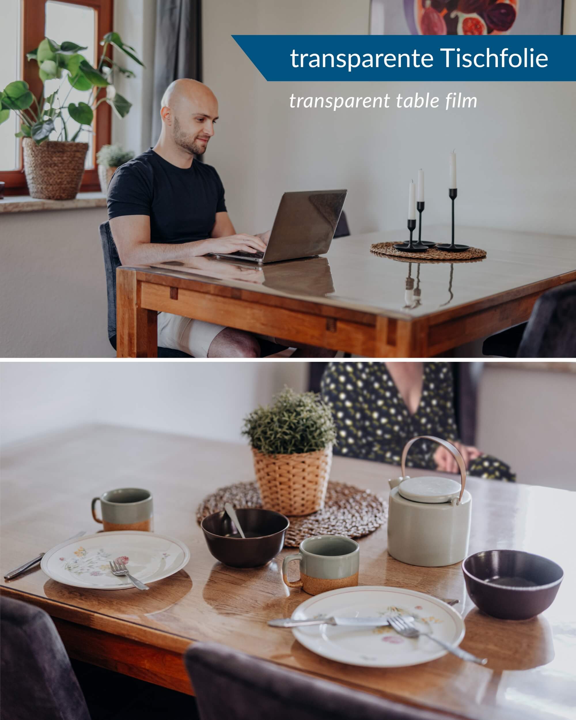 Eine hochwertige Tischfolie in transparent wirkt optisch wie eine dezente Glasplatte und fügt sich harmonisch in jedes Wohnambiente ein. Statt das Design Ihres Tisches zu verdecken, unterstreicht sie die natürliche Schönheit und Eleganz, egal ob bei edlen Holztischen, stilvollen Glastischen oder modernen Designtischen.
