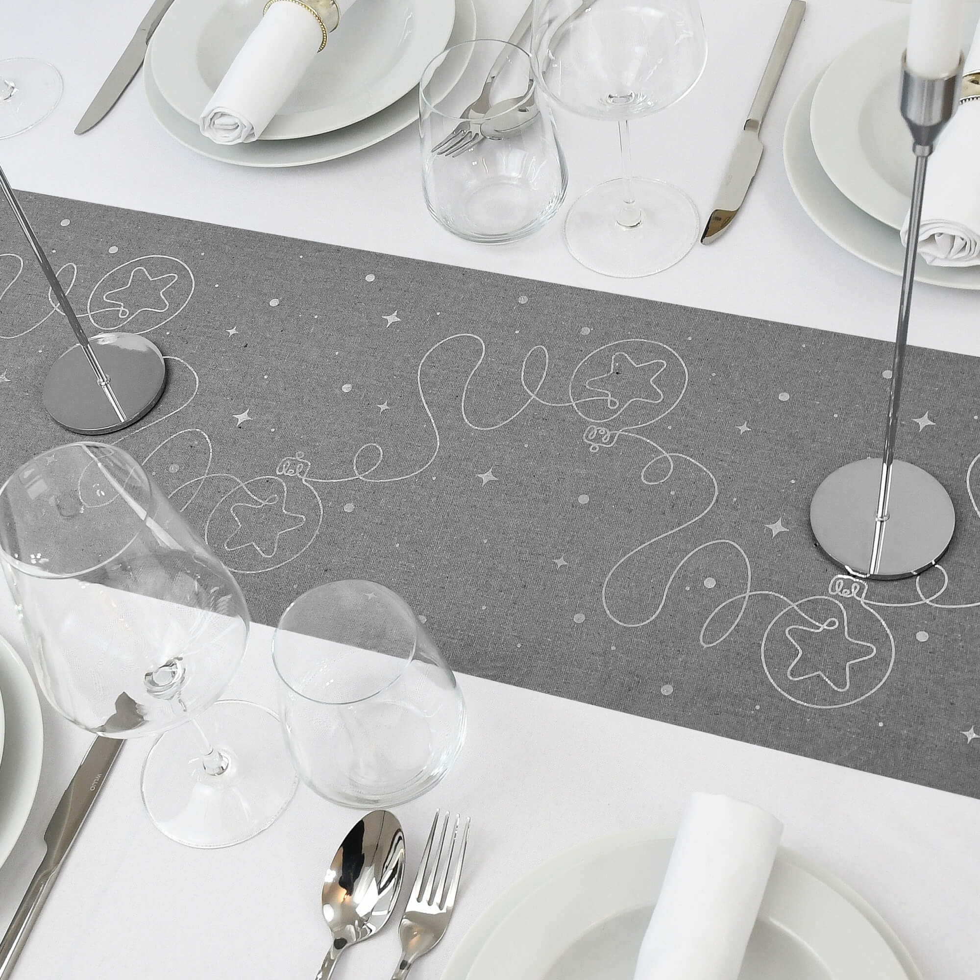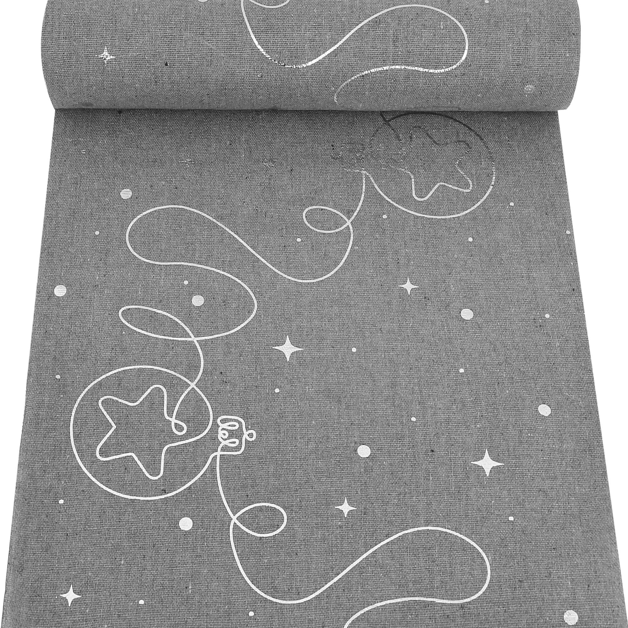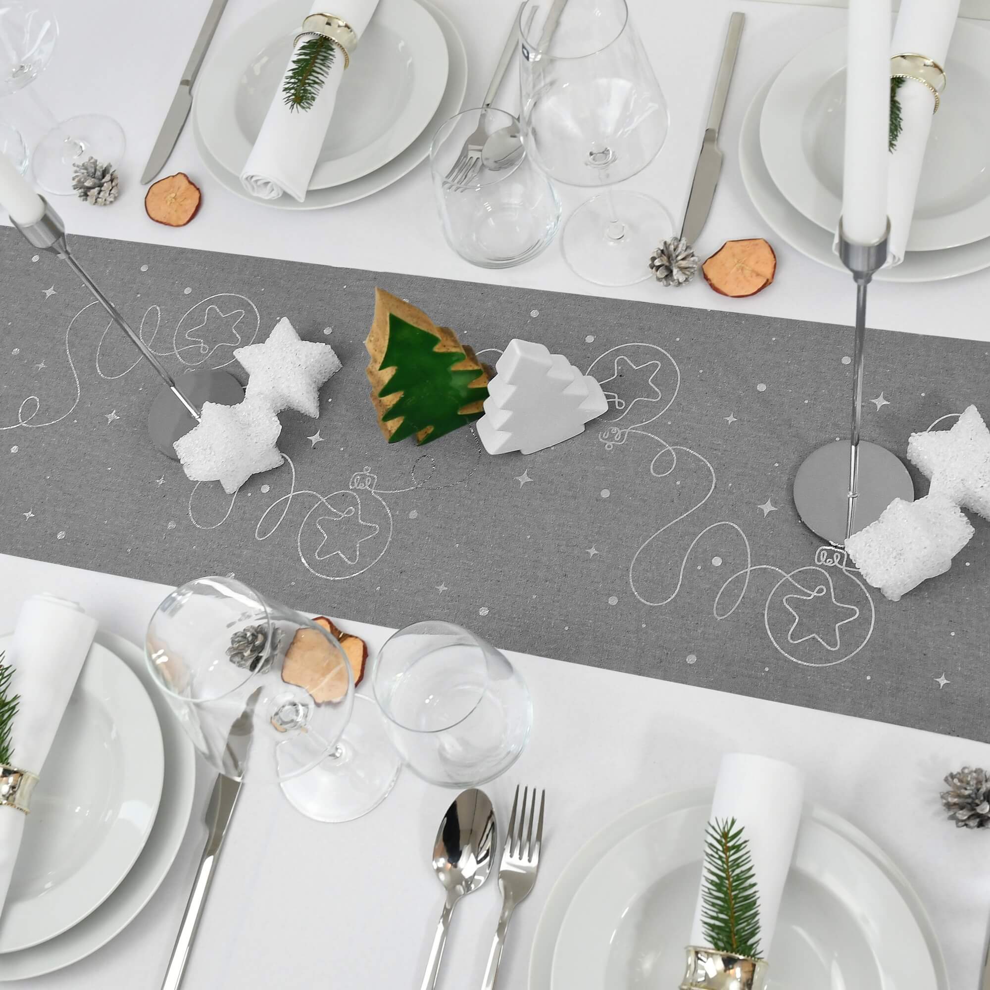 Moderno® Tischläufer Leinenoptik Grau 5 m – Silberne Weihnachtskugeln, 28 cm Breite, Weihnachtsdeko, Tischband für Weihnachten & Feiern