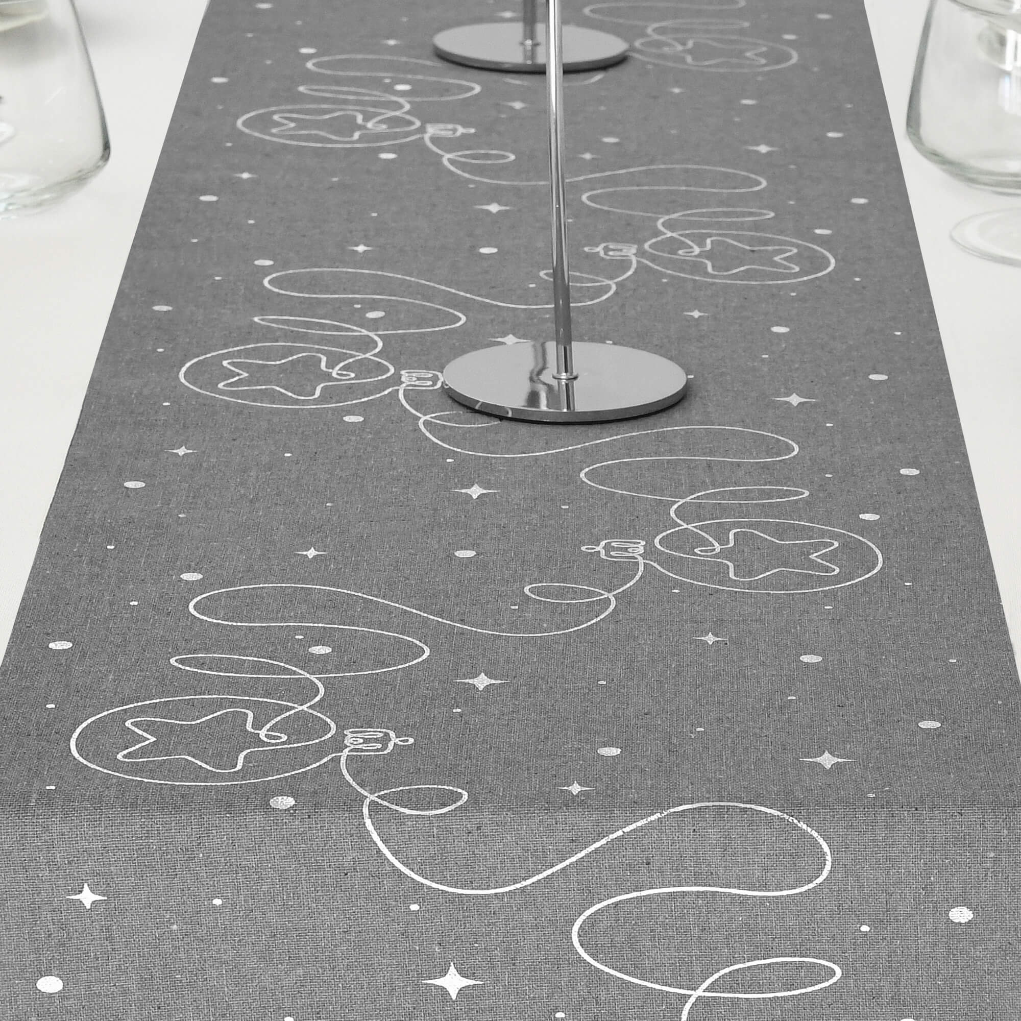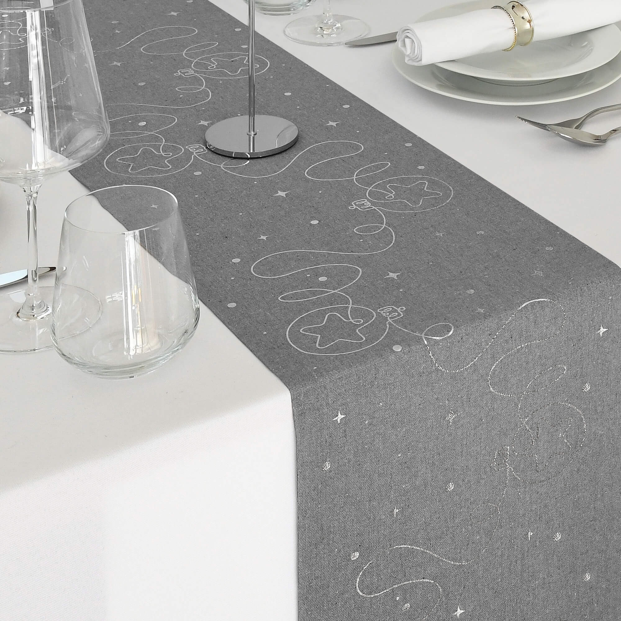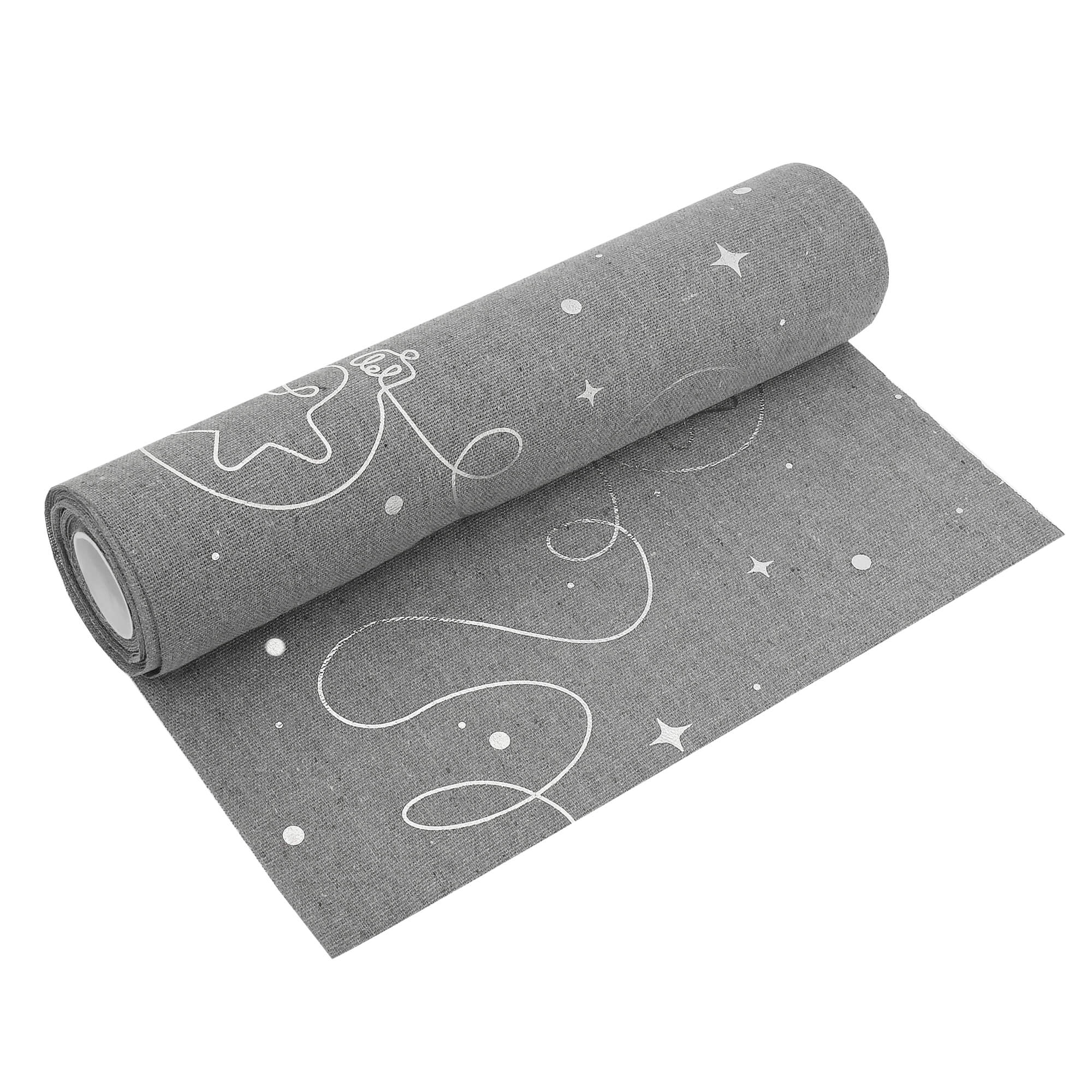Moderno® Tischläufer Leinenoptik Grau 5 m – Silberne Weihnachtskugeln, 28 cm Breite, Weihnachtsdeko, Tischband für Weihnachten & Feiern
